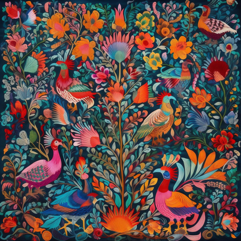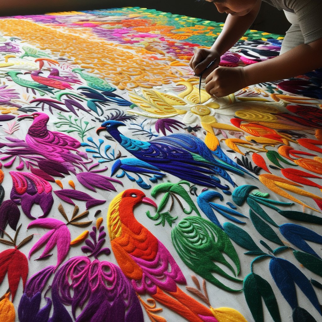 Les points utilisés dans les broderies Tenango sont principalement des points de chaînette et de tige, qui permettent aux artisans de créer des contours précis et des remplissages colorés. Les couleurs vives et variées utilisées dans les broderies Tenango sont obtenues grâce à des fils de coton ou de soie, parfois teints avec des pigments naturels. Les artisans choisissent soigneusement les couleurs pour créer un contraste saisissant entre les différents éléments du motif.